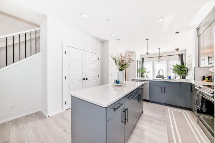 Step inside to a bright, open-concept main floor flooded with natural light. The inviting living room features a chic, neutral colour palette, beautiful flooring, and an elegant staircase, creating a sophisticated and comfortable space.