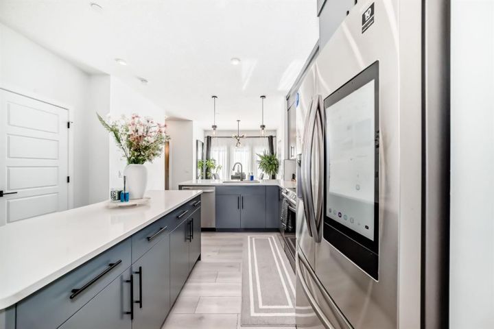 The gourmet kitchen is a chef's dream, boasting striking blue-grey cabinetry, pristine white quartz countertops, sleek stainless steel appliances (including a modern fridge with a smart display), and a large central island perfect for meal prep and entertaining. Adjacent to the kitchen, the dining room offers a stylish space for family dinners with an eye-catching light fixture and large windows overlooking the yard. A convenient and beautifully appointed powder room is also located on the main floor.