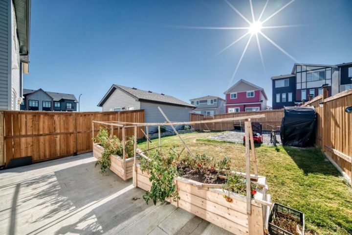 The home's exterior boasts attractive curb appeal with its modern architecture and striking siding. The private backyard is an oasis for relaxation and fun, featuring a well-maintained lawn, a back lane for easy access, and charming raised garden beds—perfect for a home gardener! A dedicated fire pit area makes it ideal for cool Calgary evenings and entertaining guests.
