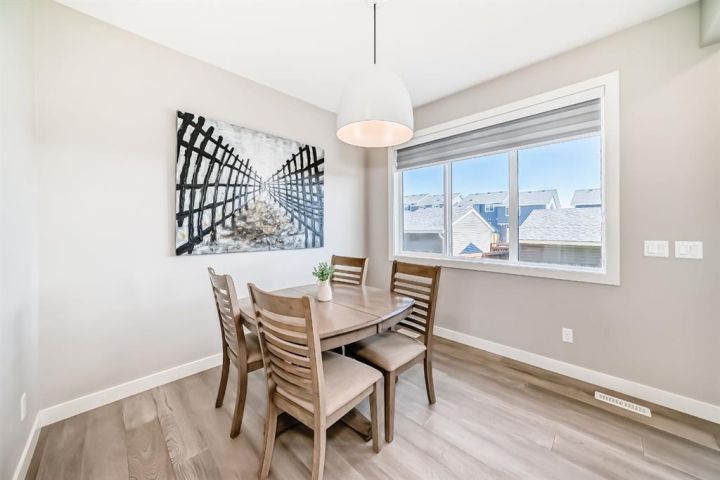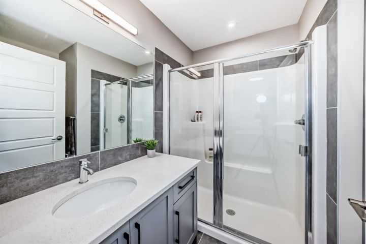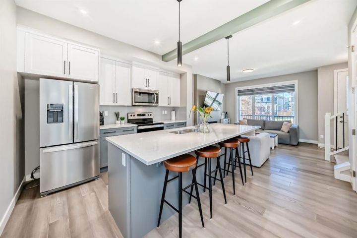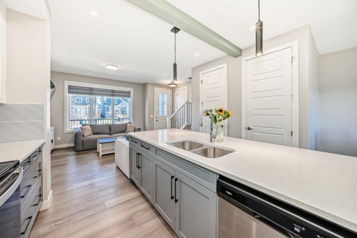 Welcome to this beautifully upgraded single-family detached home, perfectly combining modern style and everyday functionality. Step inside to find a spacious, open-concept layout featuring soaring 8-foot interior doors and high-end finishes throughout. The kitchen is a true showstopper with sleek quartz countertops, stainless steel appliances, and beautiful cabinetry—ideal for both cooking and entertaining. Relax in the cozy living area, complete with a contemporary electric fireplace that adds warmth and ambiance. This home offers three generously sized bedrooms, including a luxurious primary suite with a bit of a mountain view, a full ensuite and a large walk-in closet. The unfinished basement comes with a bathroom rough-in, offering endless potential to create the space you need. Outside, enjoy a beautifully landscaped yard, a back deck perfect for BBQs, and an oversized, insulated garage with plenty of room for vehicles, storage, or a workshop. Located in a vibrant and convenient community, you're just steps away from schools, walking paths, parks, and the nearby Trading Post commercial area, featuring restaurants, a convenience store, dental office, pharmacy, bakery, and more. This home truly offers the perfect blend of comfort, style, and location.