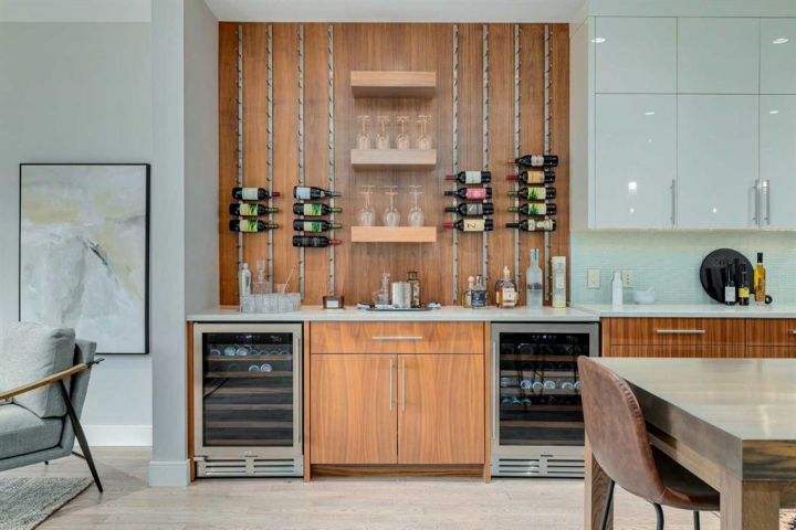 - Bar, Built-in Features, Closet Organizers, High Ceilings, Stone Counters, Walk-In Closet(s), Wired for Sound