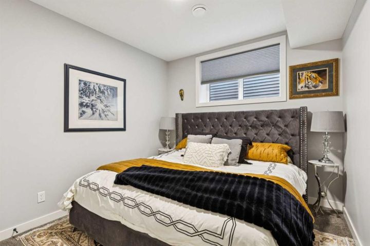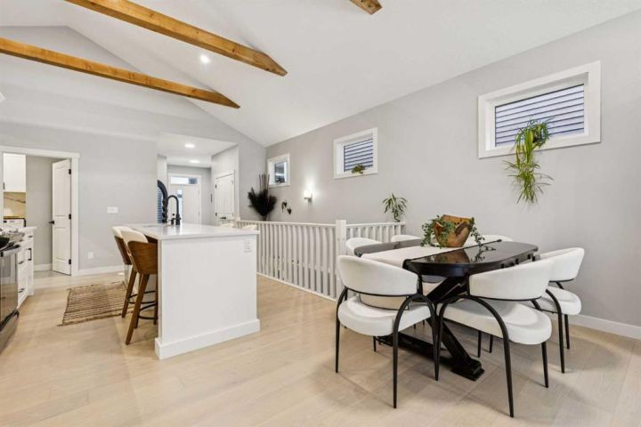 Step into this beautifully designed bungalow offering a perfect blend of style and function. The OPEN-CONCEPT main floor features soaring VAULTED CEILINGS, creating an airy and spacious feel. The kitchen impresses with QUARTZ COUNTERTOPS, a striking FEATURE HOOD FAN, updated tile backsplash, and ample cabinetry — perfect for entertaining or quiet evenings at home. The living room features an ELECTRIC FIREPLACE on a FEATURE WALL making a stunning focus in the room. A stylish MAIN FLOOR OFFICE with a BARN DOOR and custom attachment offers the ideal work-from-home setup. Nearby, the UPGRADED LAUNDRY ROOM boasts a countertop, SHELVING, and CABINETRY with UPGRADED TILE. The elegant half bath showcases a SLATTED ACCENT WALL, QUARTZ COUNTERS, and UPGRADED FIXTURES. The primary bedroom is a true retreat with a generous WALK-IN CLOSET and a spa-inspired ENSUITE featuring DUAL SINKS and a fully TILED SHOWER. Downstairs, the FULLY FINISHED BASEMENT offers a cozy family room with a FEATURE WALL and DRY BAR, two additional bedrooms, and a modern 4-piece bathroom — perfect for guests or family. Step outside to your WEST-FACING backyard oasis. Enjoy a TWO-TIERED DECK with PRIVACY WALL in the PERGOLA with a ROOF, BUILT-IN BENCH, and beautiful landscaping including florals and a PAVING STONE PATHWAY — all while taking in scenic views of Cochrane. This home blends high-end finishes with thoughtful design in one of Cochrane’s most desirable communities. Don’t miss it!