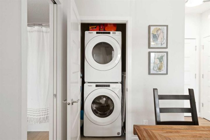 - Dishwasher, Electric Range, Microwave Hood Fan, Washer/Dryer Stacked