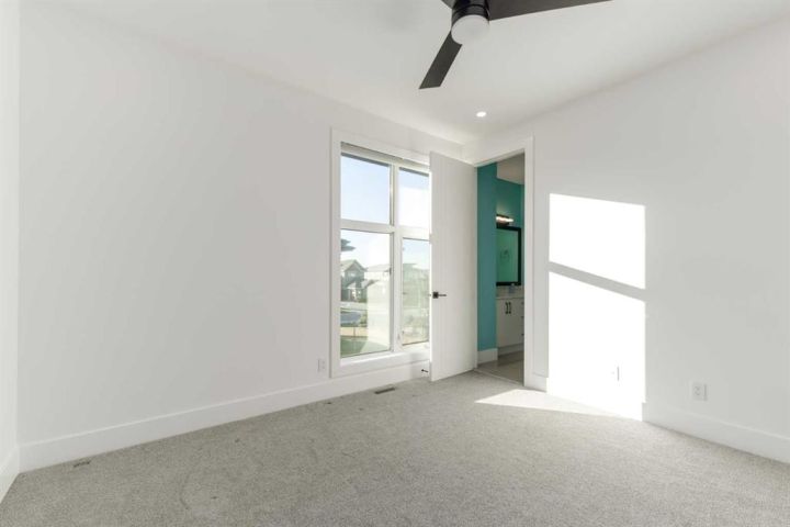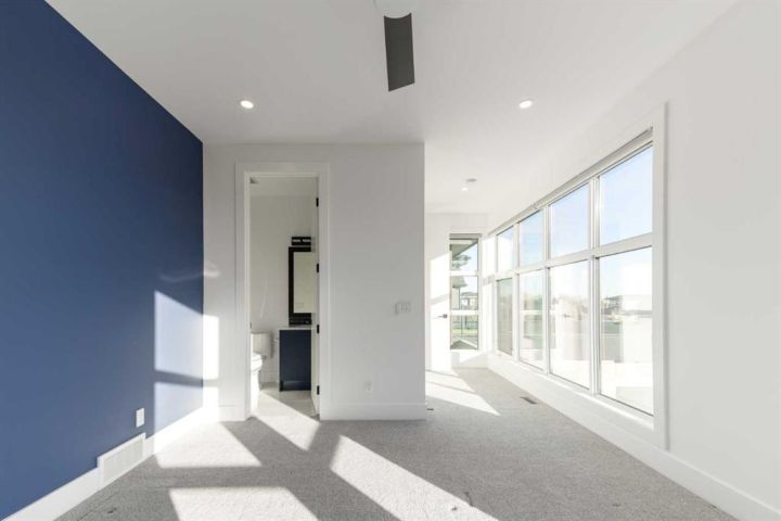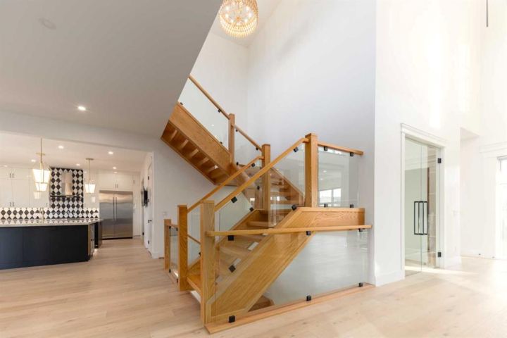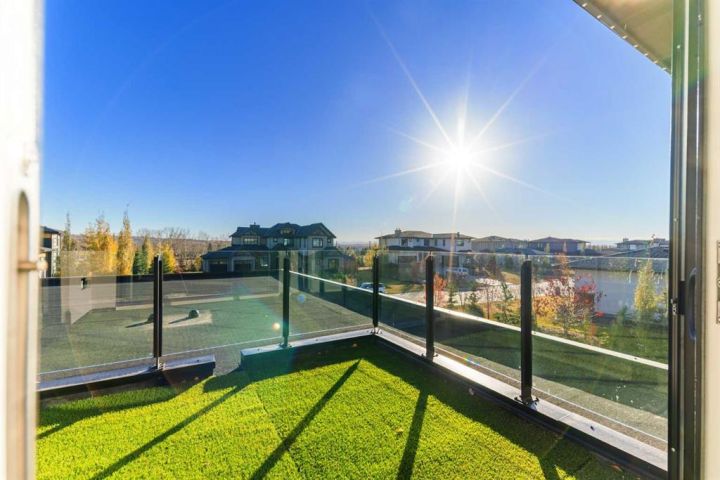 This modern estate in Calgary’s prestigious Watermark community showcases precision construction, advanced systems, and contemporary design. A heated four-car garage features a durable epoxy floor, radiant in-floor and gas heating, a half bath, and ample space for a workshop or bench setup. Inside, a residential elevator provides full accessibility across all levels, while engineered hardwood flooring, custom millwork, and an open-riser glass staircase define the home’s architectural character. The great room features a tray ceiling with recessed lighting and a linear gas fireplace framed in charcoal tile, blending form and function. The chef’s kitchen is anchored by dual onyx-clad islands, gloss-white cabinetry, brass fixtures, and Jenn-Air professional appliances, complemented by a full prep kitchen with induction cooktop, secondary refrigerator, and dishwasher for seamless entertaining. The formal dining area includes built-in cabinetry, crown detailing, and geometric backsplash, while a front sitting room with a wood-accent fireplace, glass-enclosed office, and powder room with onyx counter and brass accents complete the main level. A well-appointed mudroom offers full-height storage, marbled tile, and a built-in bench for easy transitions. Upstairs, the primary suite includes a private balcony with mountain views, dual walk-in closets, and a spa ensuite with heated floors, dual vanities, steam shower with dual rain heads, and a deep soaker tub. Three additional bedrooms feature walk-in closets, with both Jack & Jill and private ensuite layouts. The upper level also offers a loft, study nook, and laundry room with quartz counters, extending to an outdoor patio finished with glass railings and synthetic turf. The lower level is designed for recreation and fitness, with a quartz wet bar, brass fixtures, beverage fridge, custom shelving, media area, mirrored gym, and two bedrooms with walk-in closets and full baths. Finishes include luxury vinyl plank, recessed lighting, and marbled tile throughout. Mechanical highlights feature radiant in-floor heating throughout the lower level, high-efficiency HVAC, smart lighting controls, and an integrated sound system — combining craftsmanship, durability, and performance in one of Watermark’s most technically refined residences.